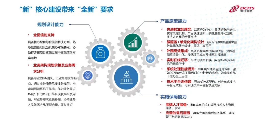 “新”核心建设带来了“全新”要求,赵巍认为,在规划设计能力、产品原型能力和实施保障能力等方面,企业都需要具备相应的人才、资源和素质。BB贝博艾弗森官网通过大量的实践与技术储备,有能力、有信心帮助金融机构解决相关问题。尤其是在“新核心”的实施过程中,BB贝博艾弗森官网通过对关键要素的重点把控,有效的帮助金融机构实现焕新发展: